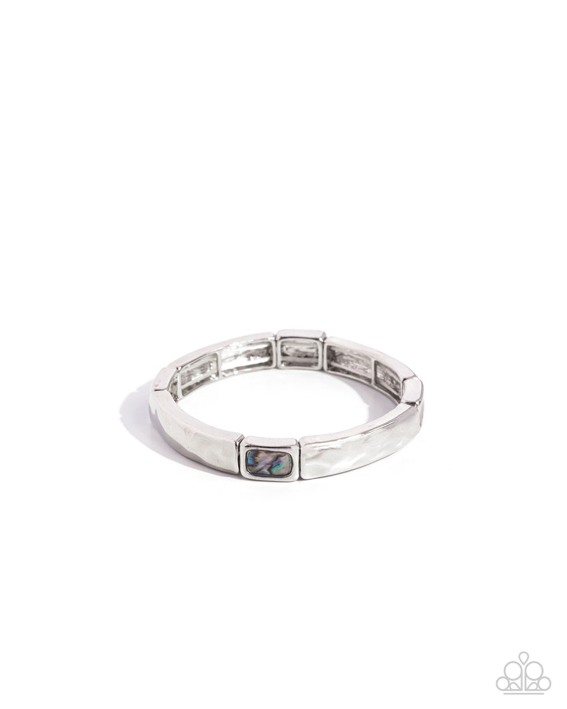 Featuring a faux blue abalone shell, silver squares of various sizes are strung along elastic stretchy bands around the wrist for a tastefully trendy display. Due to its prismatic palette, color may vary.
