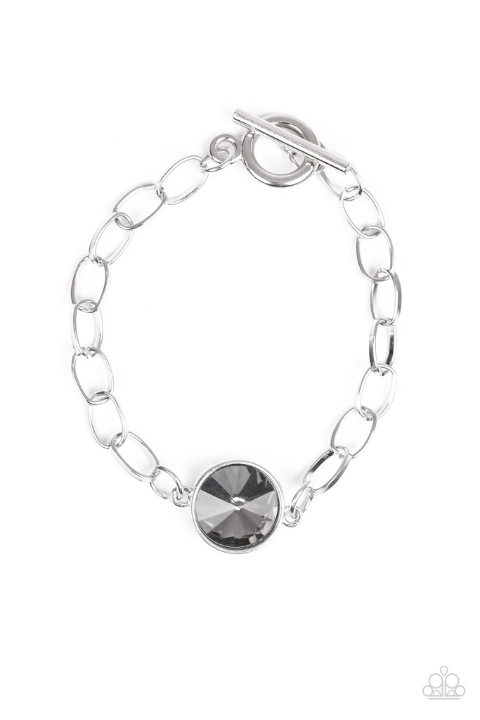 A dramatic smoky gem attaches to a shiny silver chain, creating a blinding centerpiece atop the wrist. Features a toggle closure.