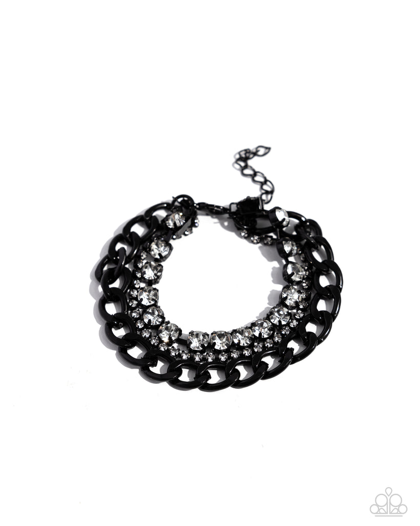 A collection of mismatched black-painted chains collide with bold-faceted white gems in pronged black-painted fittings and a daintier strand of rhinestones in the same fittings for a colorfully constructed look. Features an adjustable clasp closure.