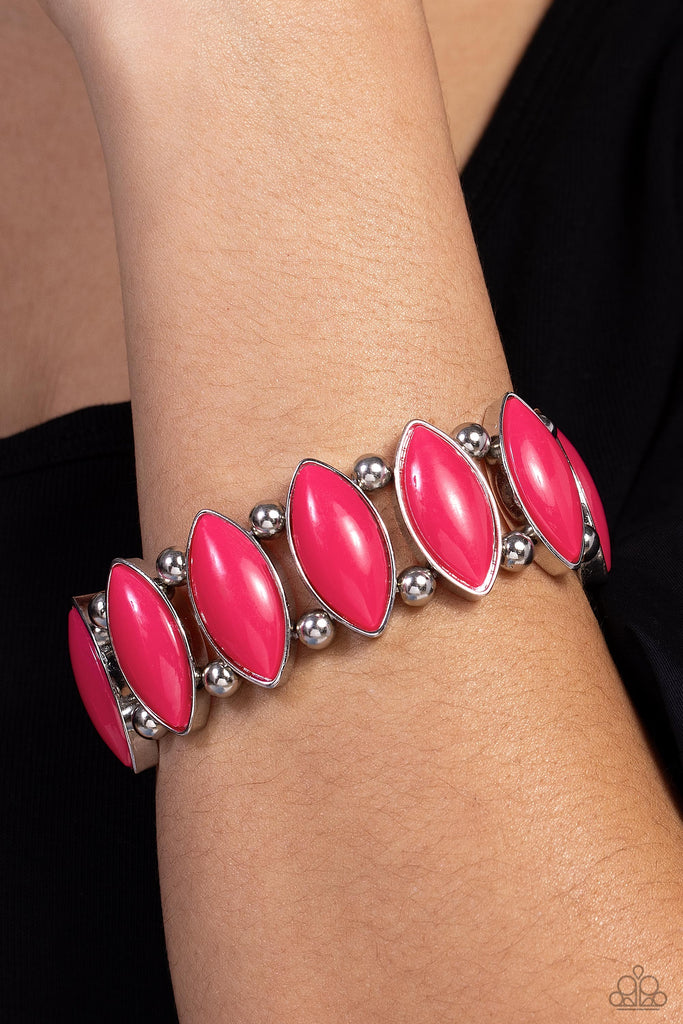 Encased in sleek silver frames, oversized Fuchsia Fedora beaded frames alternate with pairs of classic silver beads along stretchy bands around the wrist for a vivacious pop of color.