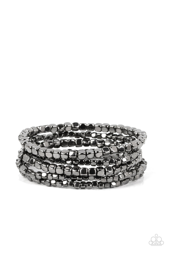 A dainty collection of glistening gunmetal cube beads are threaded along stretchy bands around the wrist, creating edgy layers.