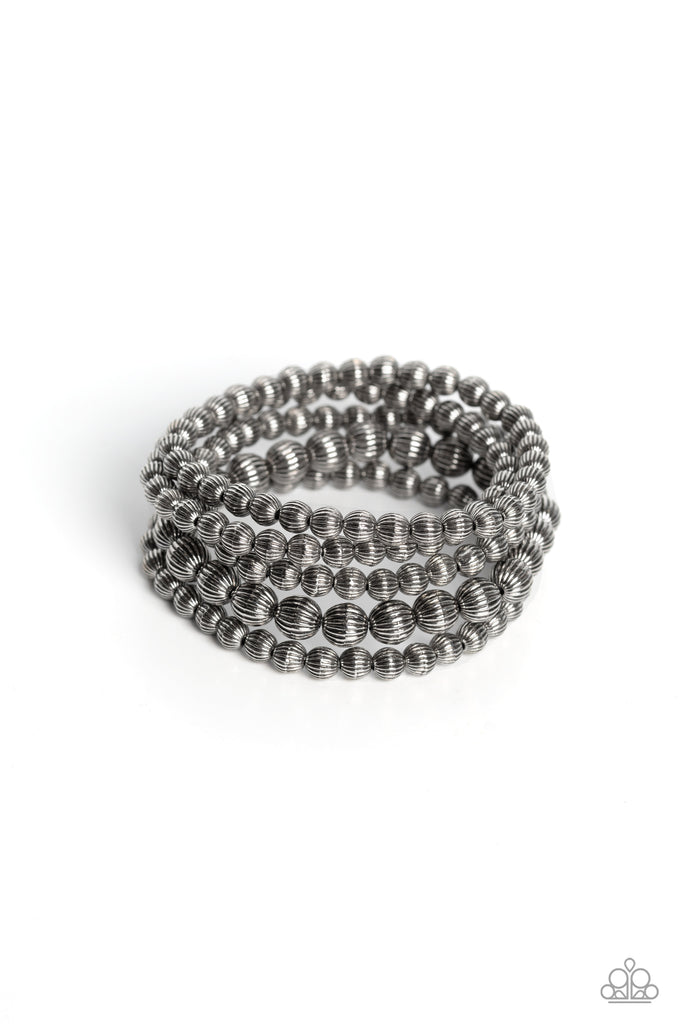 Gritty strands of silver beads etched in linear patterns wrap around the wrist on stretchy bands. One strand of the linear silver beads features bigger beads than the rest of the collection for an earthy contrast to the design.