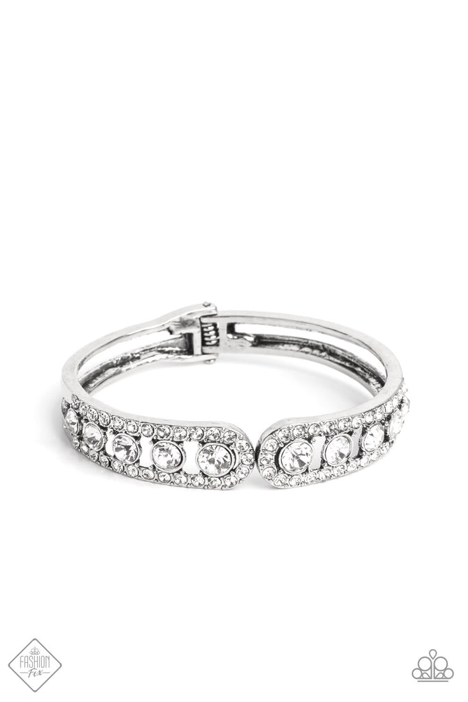 Dazzling white rhinestones fall in line between two thick bands of silver, as they wrap around the wrist in a glitzy display. The rhinestones gradually increase in size as they lead towards the center, matching the flared ends of their silver encasement. Features a hinged closure.