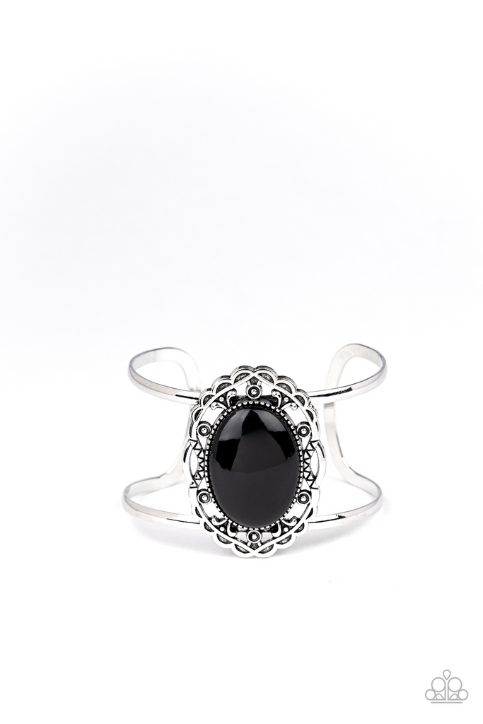 An oversized black bead is pressed into the center of a decorative filigree-filled silver frame atop an airy silver cuff for a bold pop of color.