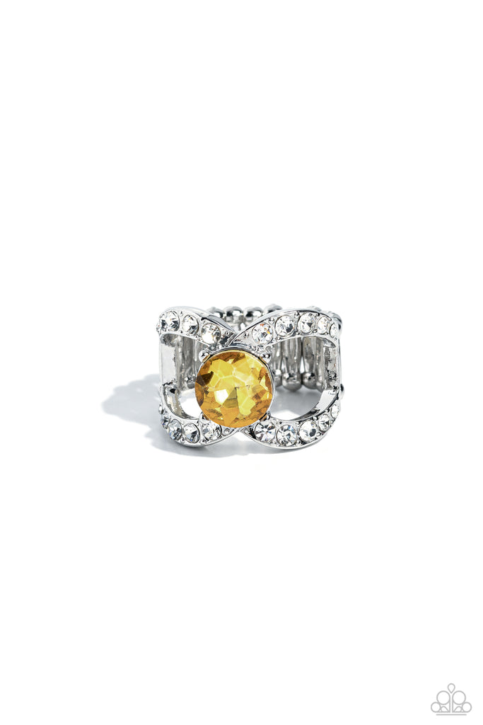Encircling a pronged, yellow gem, shimmery silver bars dusted in white gems sweep across the finger, gathering into a silver bow-like frame for a radiant finish. Features a stretchy band for a flexible fit.