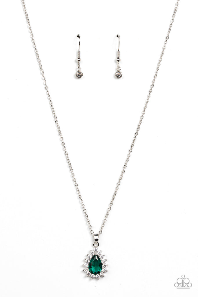 A glassy green teardrop is bordered in sparkly white rhinestones, creating a timelessly dainty pendant below the collar. Features an adjustable clasp closure.